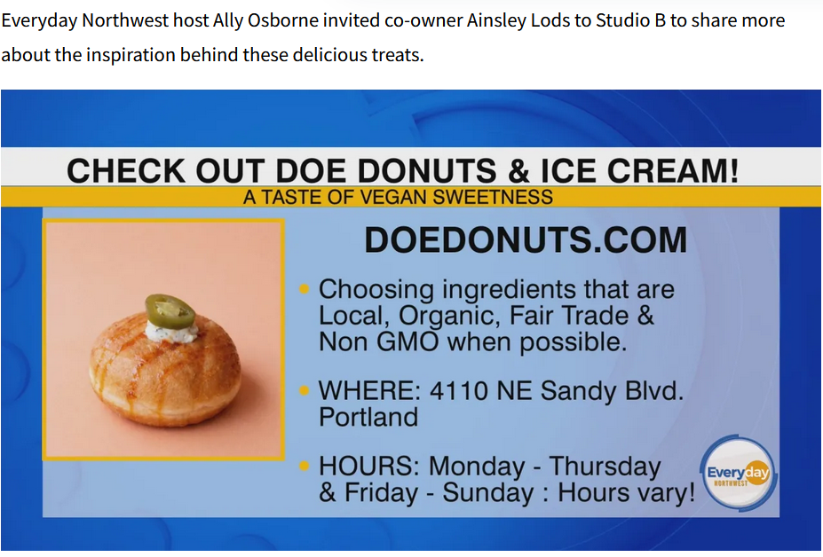 Media THE PRESS LOVES US. February 2026 April 8th 2026Live segment on Everyday Northwest Spaghetti DonutsFox12 Oregon EverOut Spaghetti DonutsThe Oregonian Yelp’s top 100 US Ice Cream Shops 2023Yelp 12 Must-Try Vegan Donut Shops in the US 2024 VegOut These 4 Oregon doughnut shops made a list of the country’s 100 bestOregon Live Yelp’s Top 100 US Donut Shops 2023Yelp Doe on “Somebody Feed Phil” Portland’s knockout ube treatsEater.com Summer’s Top Spots for Vegan Ice Cream and Frozen TreatsEater.com PORTLAND MONTHLY best of vegan 2021Veg News 15 Essential Vegan and Vegetarian Restaurants in PortlandEater.com 14 Standout Spots in Hollywood Best Vegan Donuts in the US Yelp releases its top destinations for food lovers in 2020Good Morning America Vegans get another great spot to tame their sweet tooth in the Rose CityFox12 Oregon Enjoy a special lineup of Summer vegan donuts from Doe DonutsKGW8 / Tonight with Cassidy A vegan’s guide to PortlandVeganfoodandliving.com MORE gets a peek at some of the sweet treats "Doe Donuts" has to offerFox12 Oregon veggie awards 2018Veg News The 16 Craziest Donut Flavors to Try for National Donut DayBrit.co Portland gets its first all vegan donut shopVeg News Devour Portland’s Newest Crop of Vegan BrunchesPortland Monthly it’s morning in the numbersFood and Drink 5 must-eat vegan dishes in PortlandPortland Monthly doughnuts, pizza, burgers, and more vegan food newsPortland Monthly Portland’s first vegan doughnut shop is open and fryingEater move in, start eatingPortland Mercury can these 20 donuts heal America?Veg News the 5 best donut shops in PortlandFoodie Snitch Eat More ‘Hole’ Foods: Drool Over PETA’s Top Vegan Doughnut PicksPETA Take The Oregon Donut Trail For A Delightfully Delicious Day TripOnly In Your State What to order at Portland's first vegan doughnut shop: Scouting ReportOregon Live doe donuts offering vegan donuts in se PortlandKGW8 Doe Donuts: Portland's first all-vegan doughnut shop finds unique combinations to satisfyKATU8 ON THE GO WITH JOE AT DOE DONUTSFox12 Oregon this may come as a surprise, but Portland didn’t have an all vegan donut shop until this week More Good Day Oregon